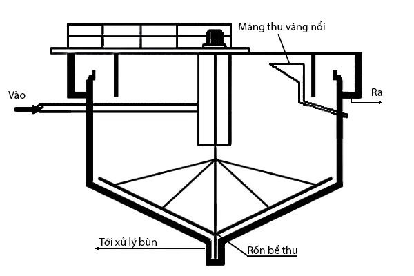 Bể lắng đứng còn được gọi là bể lắng ly tâm: đặc trưng của bể lắng là hỗn hợp nước bùn đi từ dưới lên trên, bùn nặng lắng xuống dưới còn nước trong răng cưa thoát ra ngoài.